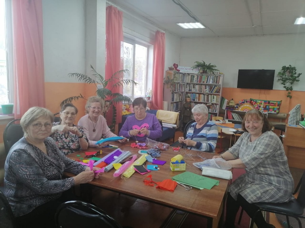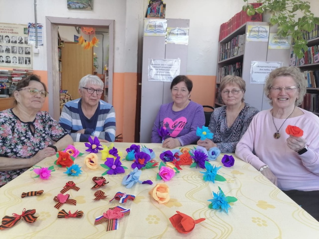На мастер-классе участники научились создавать объёмные розы, пионы и гвоздики из гофрированной бумаги и собирать из них неповторимые ветки Победы.