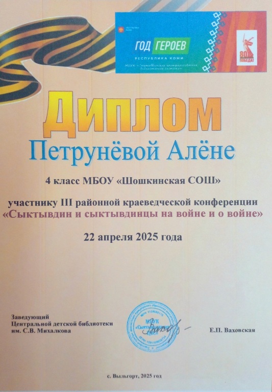 22 апреля в Центральной детской библиотеке прошла III районная краеведческая конференция "Сыктывдин и сыктывдинцы на войне и о войне", посвящённая 80-летию Победы в Великой Отечественной войне 1941-1945 годов, Году защитника Отечества и Году героев Коми.