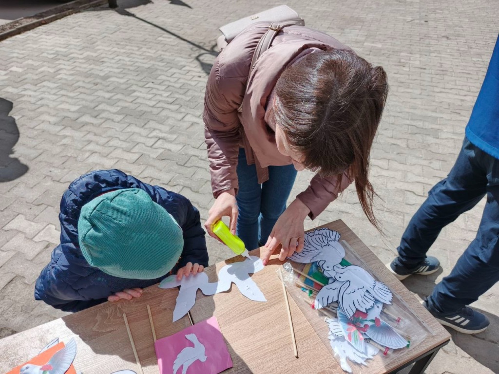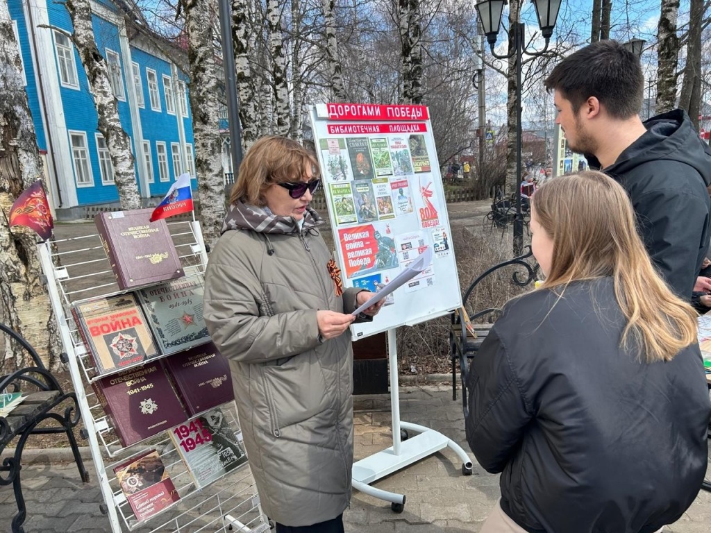 В сквере памятника С. И. Налимова развернулась библиотечная площадка "Дорогами памяти". Читатели участвовали в викторине по фильмам и произведениям о Великой Отечественной войне, мастерили флажки с голубями, писали письма солдатам и учились складывать их в треугольники.