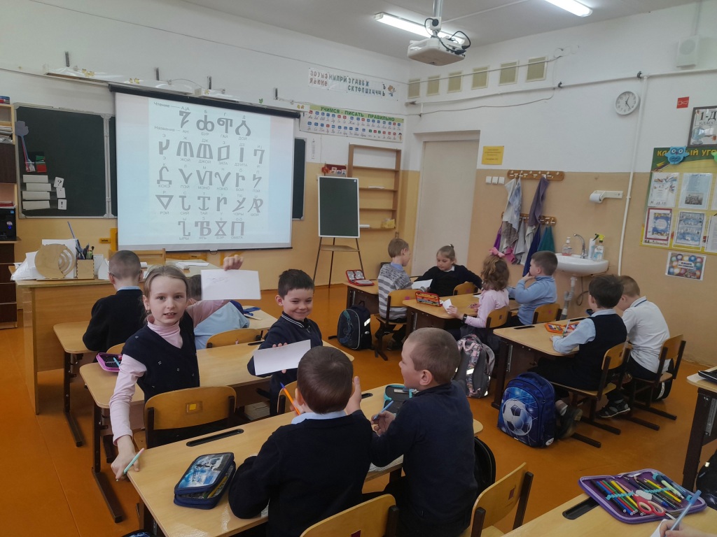 Библиотекарь познакомила учащихся с создателем первой Коми азбуки «Анбур» Стефаном Пермским. Показала пасы-родовые знаки Коми, после ребята написали свои имена буквами азбуки Стефана Пермского.