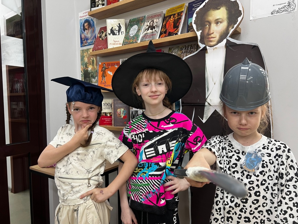 Ребят помладше на станции «Сказочная рыбалка» ждали изображенные на картинках сказочные предметы. Доставали они их с помощью магнитной удочки. Также желающие фотографировались возле выставки «Идут века, но Пушкин остается». Детей очень порадовал реквизит, подготовленный сотрудниками: рыцарский шлем и меч, волшебные шляпы и шляпа учёного Кота. Игра прошла весело и незабываемо. Надеемся, что Пушкинский день надолго останется в вашей памяти и вы не раз обратитесь к его удивительным и волшебным сказочным героям!