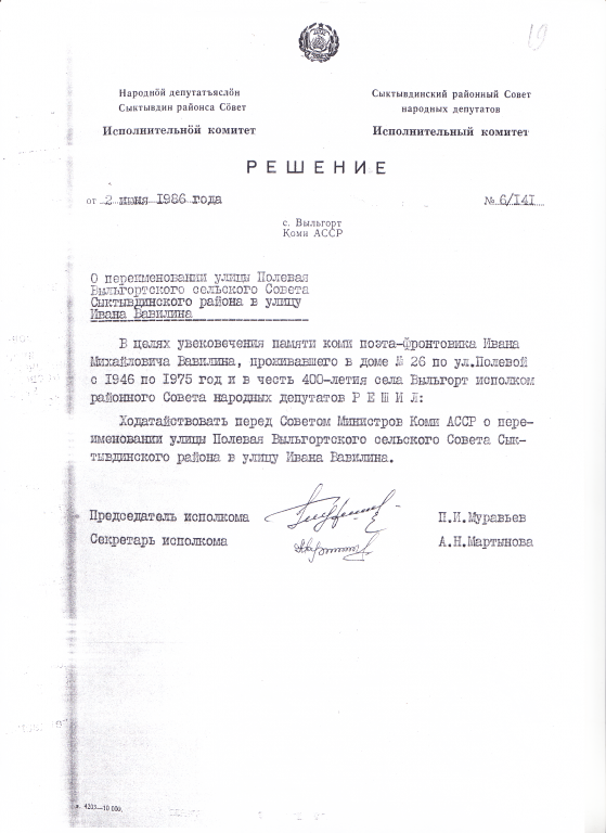 В целях увековечения памяти коми поэта-фрнтовика Ивана Михайловича Вавилина, проживающего в доме №26 по ул. Полевой с 1941 по 1975 год и в честь 400-летия села Выльгорт исполком районного Совета народных депутатов решил: ходатайствовать перед Советом Министров Коми АССР о переименовании улицы Полевая Выльгортского сельского Совета Сыктывдинского района в улицу Ивана Вавилина.