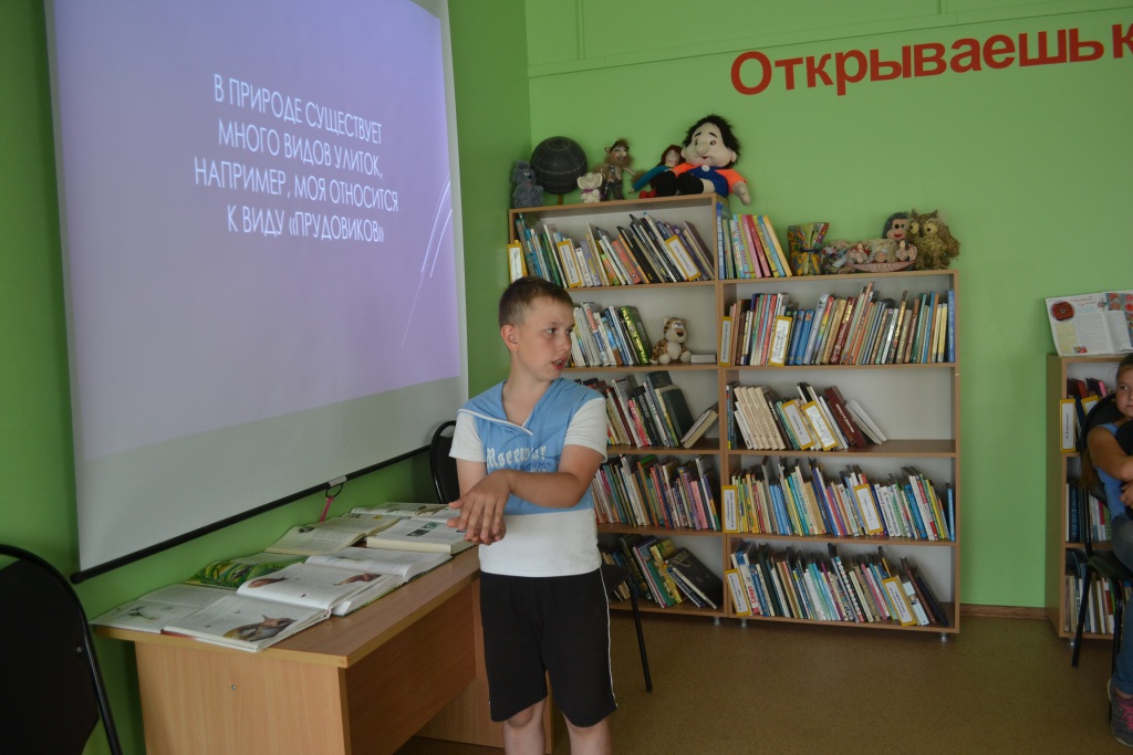 В центральной детской библиотеке прошел познавательный час, на котором участники детского оздоровительного лагеря узнали очень много нового и интересного об улитке. Максим Ковалев, учащийся 4 «г» класса ВСОШ №2, ответственно подошел к поставленной задаче: для наглядной демонстрации нашел живую улитку, относящуюся к виду «прудовиков», подготовил презентацию, сделал подборку книг об этом моллюске, нашел стихи и сказки об улитке.