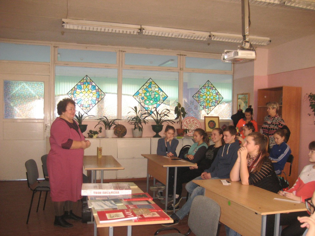 28 октября состоялась встреча учащихся 8-11 классов Палевицкой школы с редакцией журнала АРТ: главным редактором Павлом Лимеровым, редактором Татьяной Логиновой, художником – этонофутуристом Юрием Лисовским и автором журнала, председателем Союза писателей Еленой Козловой.