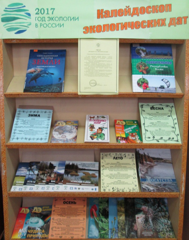 В Зеленецкой библиотеке-филиале им. А.А. Лыюрова оформлена книжная выставка «Калейдоскоп экологических дат». Выставка знакомит читателей с Международными, всемирными и российскими экологическими датами, по временам года, которые являются не менее значимыми для Земли и её обитателей.