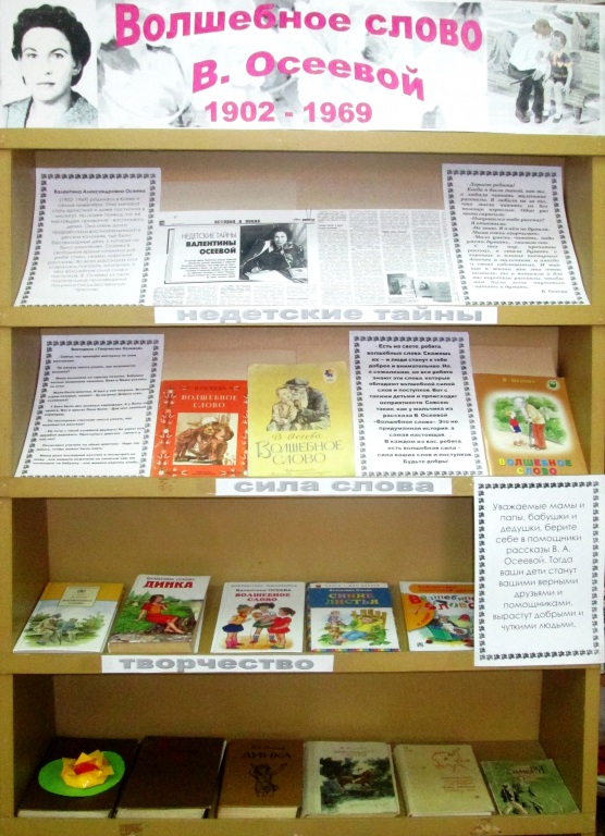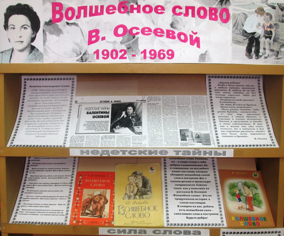 В Зеленецкой библиотеке-филиале им. А.А. Лыюрова оформлена выставка "Волшебное слово В. Осеевой" к 115-летию детской писательницы Валентины Александровны Осеевой.