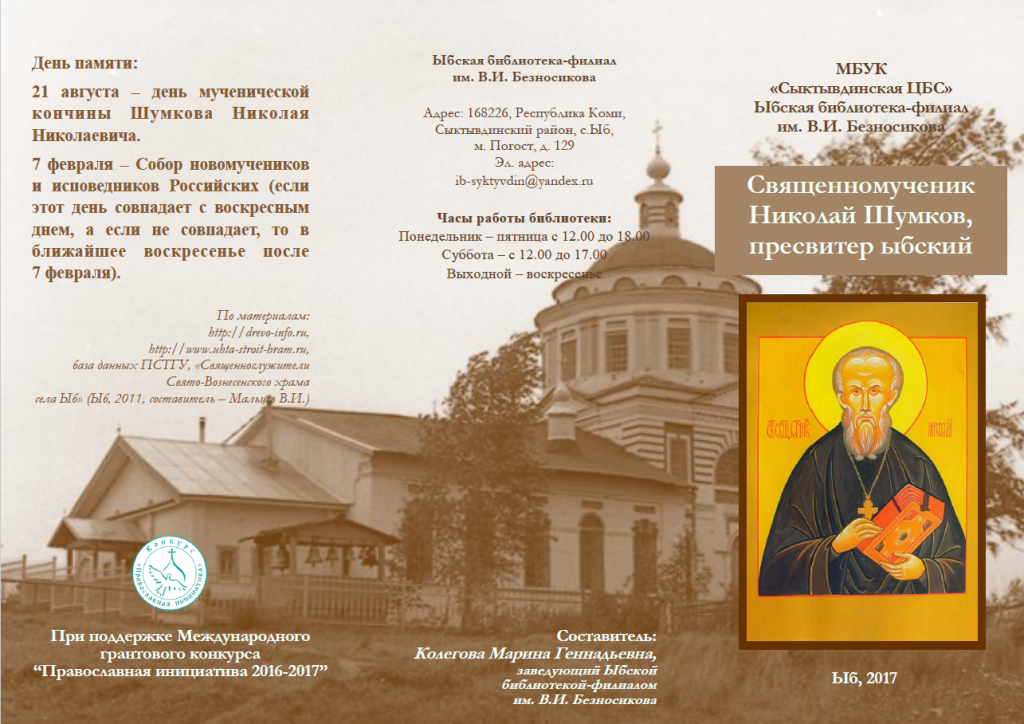 В рамках реализации проекта "Кафедра православной литературы "Земля твоя, Ыб, святая" Ыбской библиотекой была выпущена следующая издательская продукция: буклет "Священномученик Николай Шумков, пресвитер ыбский", рекомендательный список литературы "Душеполезное чтение", комплект закладок "Ыбские святыни".