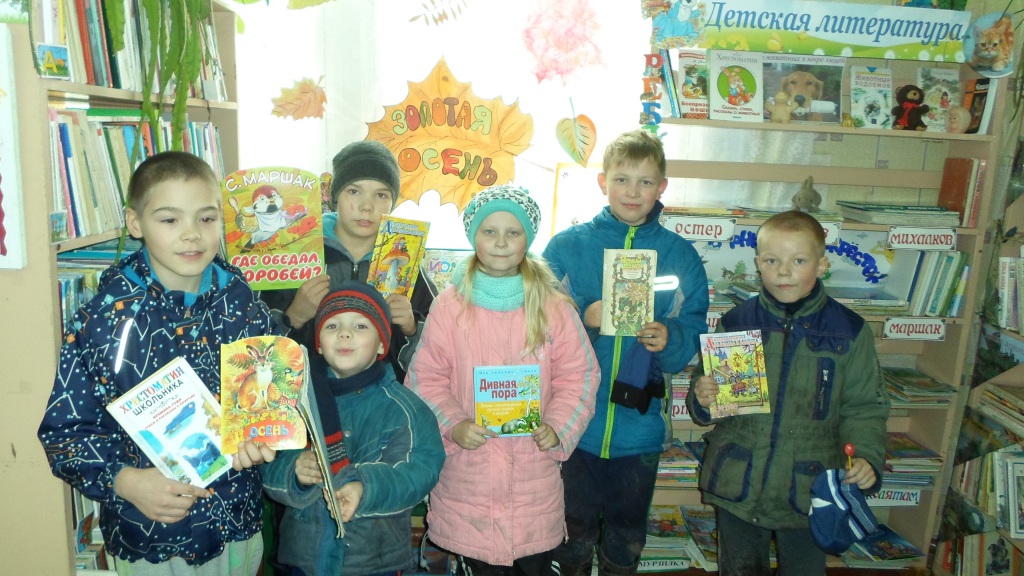 В библиотеке была развёрнута выставка «Золотая осень». В завершение мероприятия все с громким визгом побежали на улицу и устроили фейерверк из сухих листьев.