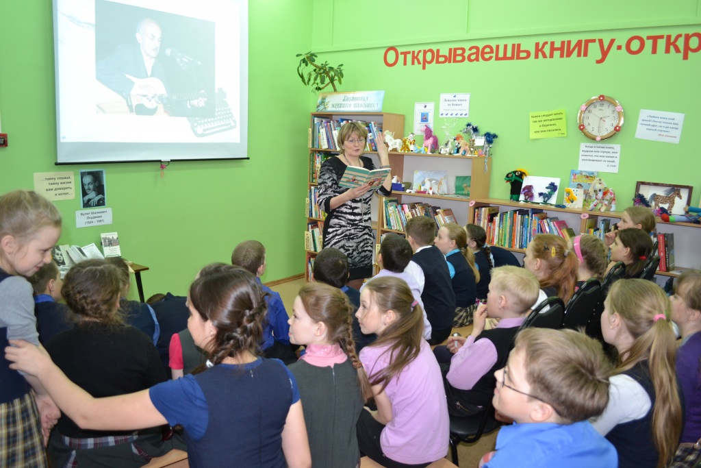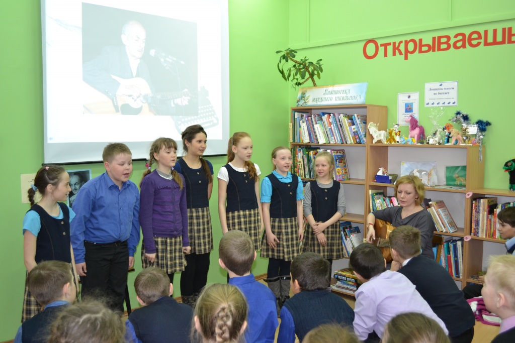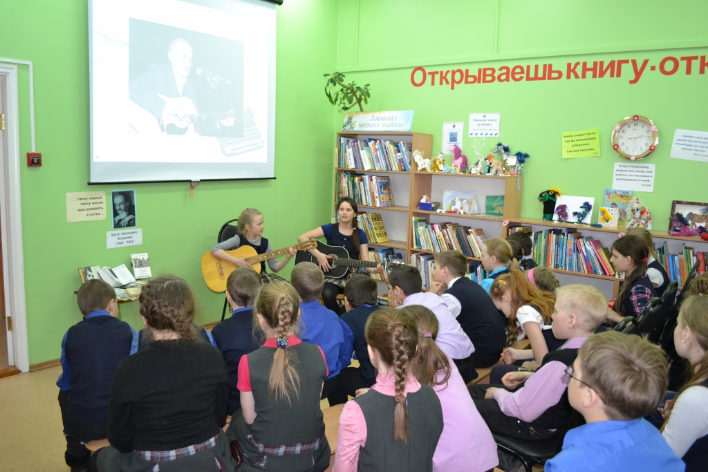 В помещениях детской библиотеки для ребят было подготовлено множество не менее интересных и познавательных встреч. Читатели познакомились со стихотворным и песенным творчеством Булата Окуджавы. В преддверии 69-й годовщины Победы и 90-летия поэта ребята послушали стихи о войне, знаменитую песню из кинофильма «Белорусский вокзал». А также узнали, что Булат Окуджава стал родоначальником нового направления на нашей эстраде – авторской песни. Гости встречи – участники клуба авторской песни из Выльгортской школы №1 и их руководитель Елена Фёдорова исполнили несколько произведений под аккомпанемент гитарных струн. Ребята с удовольствием подпевали.