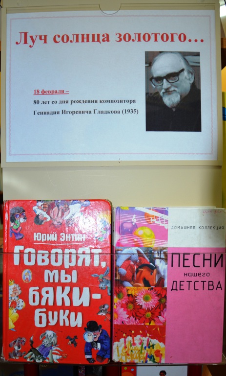 К юбилею талантливого композитора в центральной детской библиотеке оформлена книжная мини-выставка. На ней вы познакомитесь со сборником стихотворений поэта Юрия Энтина, которые стали песнями на музыку Геннадия Гладкова в мультфильмах «Бременские музыканты», «По следам Бременских музыкантов», «Новые Бременские музыканты». Также на выставке представлен сборник «Песни нашего детства» с песнями известных российских композиторов.