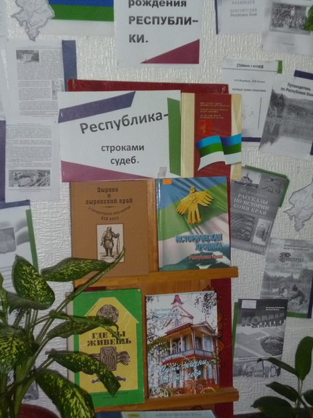 В эти памятные для Коми Республики дни в библиотеке п.Пичипашня читателей встречает выставка-стенд "Республика – строками судеб". Здесь представлены "историческая справка" по республике, сведения по государственным символам РК , книги по истории коми края.