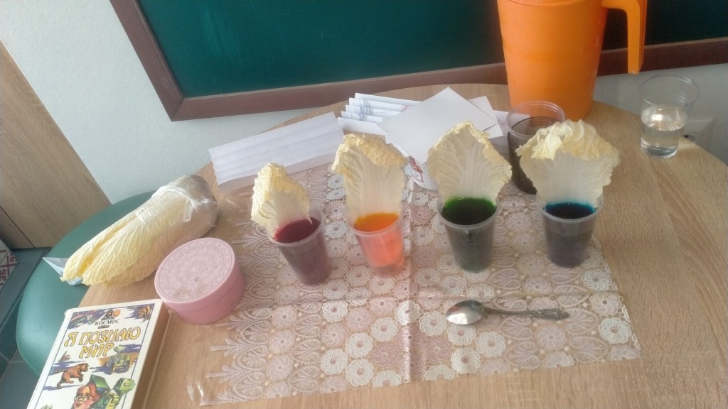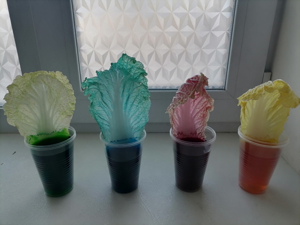 А ещё ребята посадили капустные листочки в подкрашенную воду — получилось по-весеннему красиво!