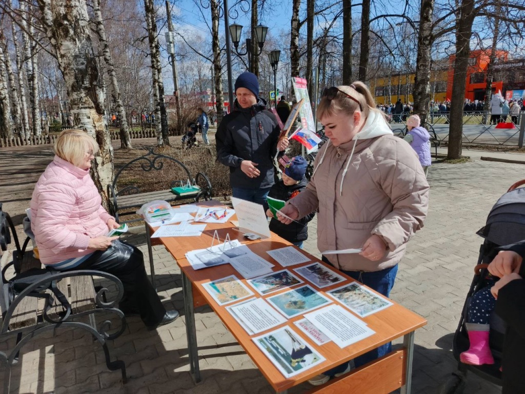 В сквере памятника С. И. Налимова развернулась библиотечная площадка "Дорогами памяти". Читатели участвовали в викторине по фильмам и произведениям о Великой Отечественной войне, мастерили флажки с голубями, писали письма солдатам и учились складывать их в треугольники.