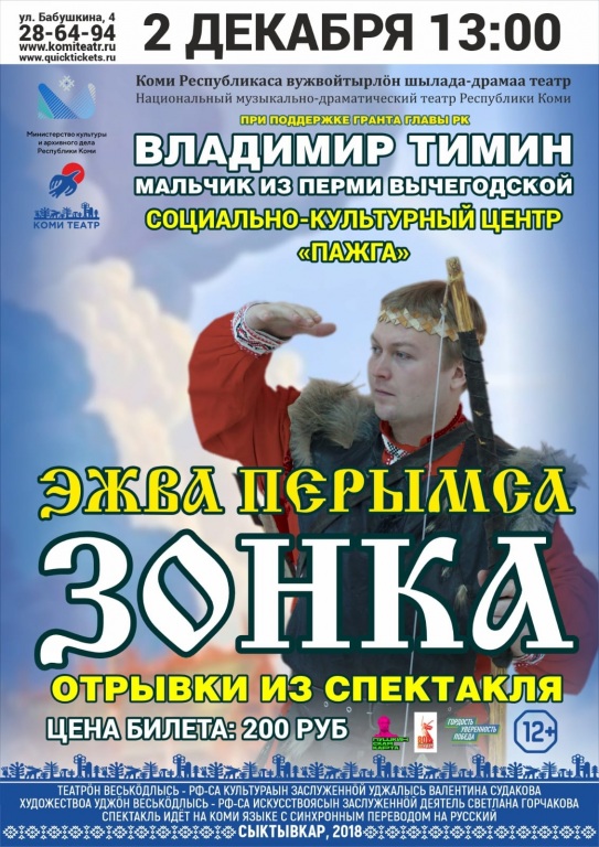 2 декабря в селе Пажга пройдёт спектакль "Эжва перымса зонка" по произведению Владимира Тимина "Мальчик из Перми Вычегодской".
