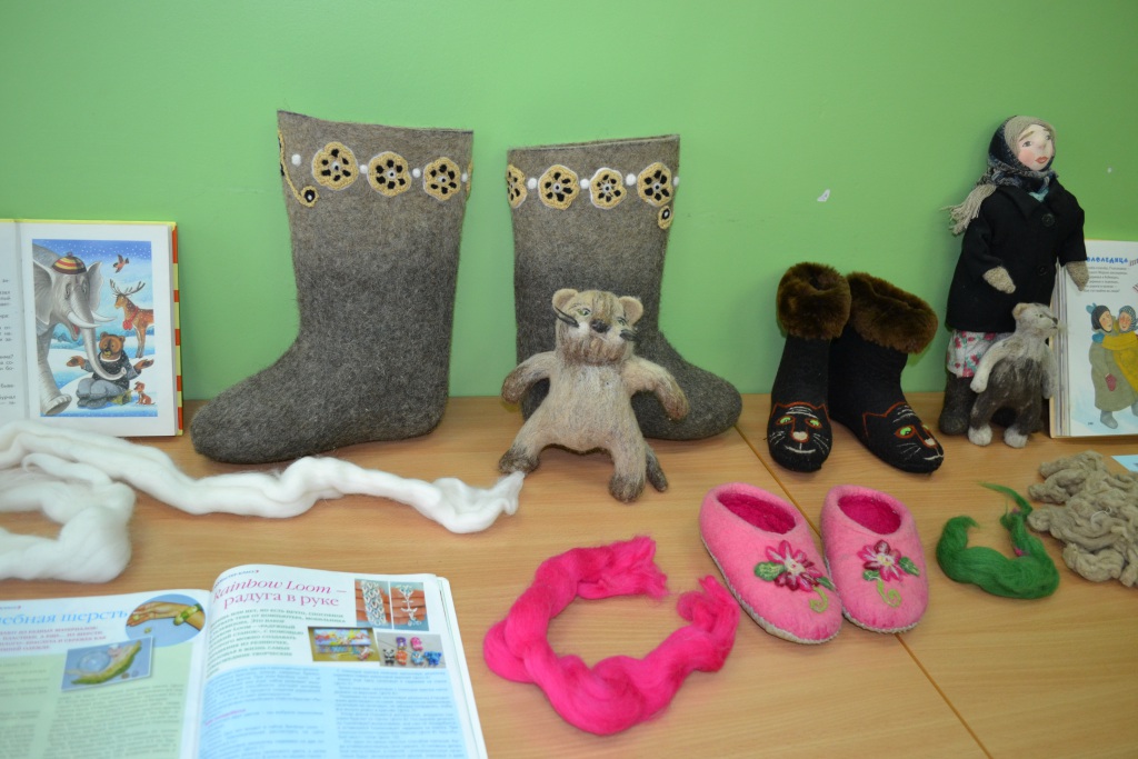На выставке, оформленной в детской библиотеке, все желающие смогли прочитать рассказы, стихи, загадки, пословицы и поговорки о валенках, а в журналах найти описание техники валяния иглой. На мини-экспозиции были представлены игрушки в технике «сухого валяния» (валяние иглой) и валенки, украшенные с помощью этой техники.