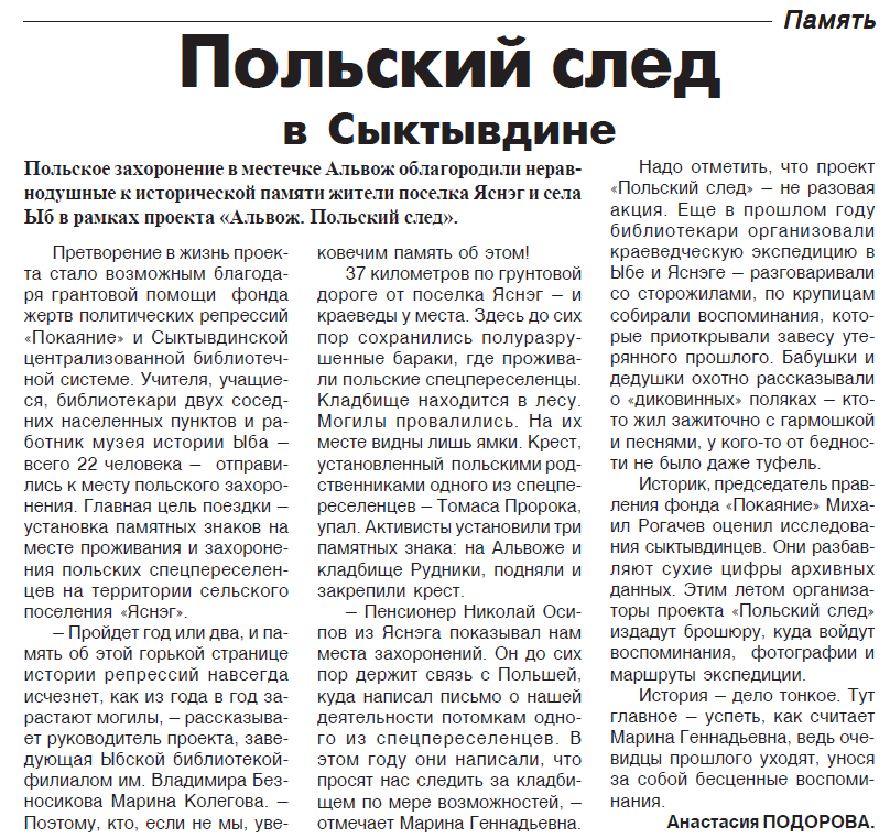 Подорова, А. Польский след в Сыктывдине / Анастасия Подорова // Наша жизнь. - 2013. - 2 июля. - с. 4.