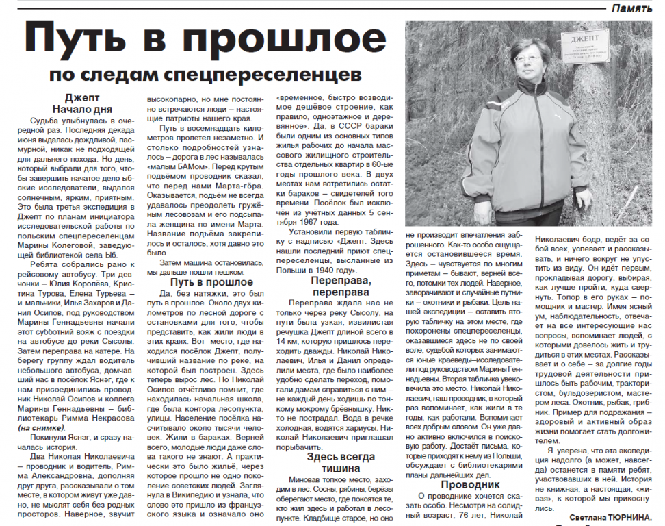Тюрнина, С. Путь в прошлое : по следам спецпереселенцев / Светлана Тюрнина // Наша жизнь. - 2014. - 15 июля. - с. 3 : фот.